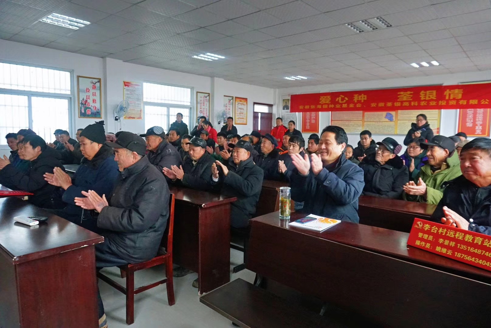 ??? 臘月的古城壽縣,寒風凜冽,壽縣迎河鎮(zhèn)李臺村村委會的會議室卻溫暖如春。1月12日,安徽荃銀高科農(nóng)投有限公司攜手安徽張海銀種業(yè)基金會及壽縣金豐公社有限公司走進壽縣迎河鎮(zhèn)開展“穗悅”精準扶貧項目活動。為當?shù)?0戶建檔立卡的貧困戶每戶送去優(yōu)質(zhì)水稻種子和化肥。壽縣扶貧辦副主任徐中貴、縣殘聯(lián)副理事長陳慶華,壽縣迎河鎮(zhèn)黨委書記李景練、副鎮(zhèn)長戴紹江,基金會秘書長張彤、安徽荃銀高科農(nóng)投有限公司總經(jīng)理助理鄭運衛(wèi)、金豐公社總經(jīng)理滕玉磊等參加了活動。