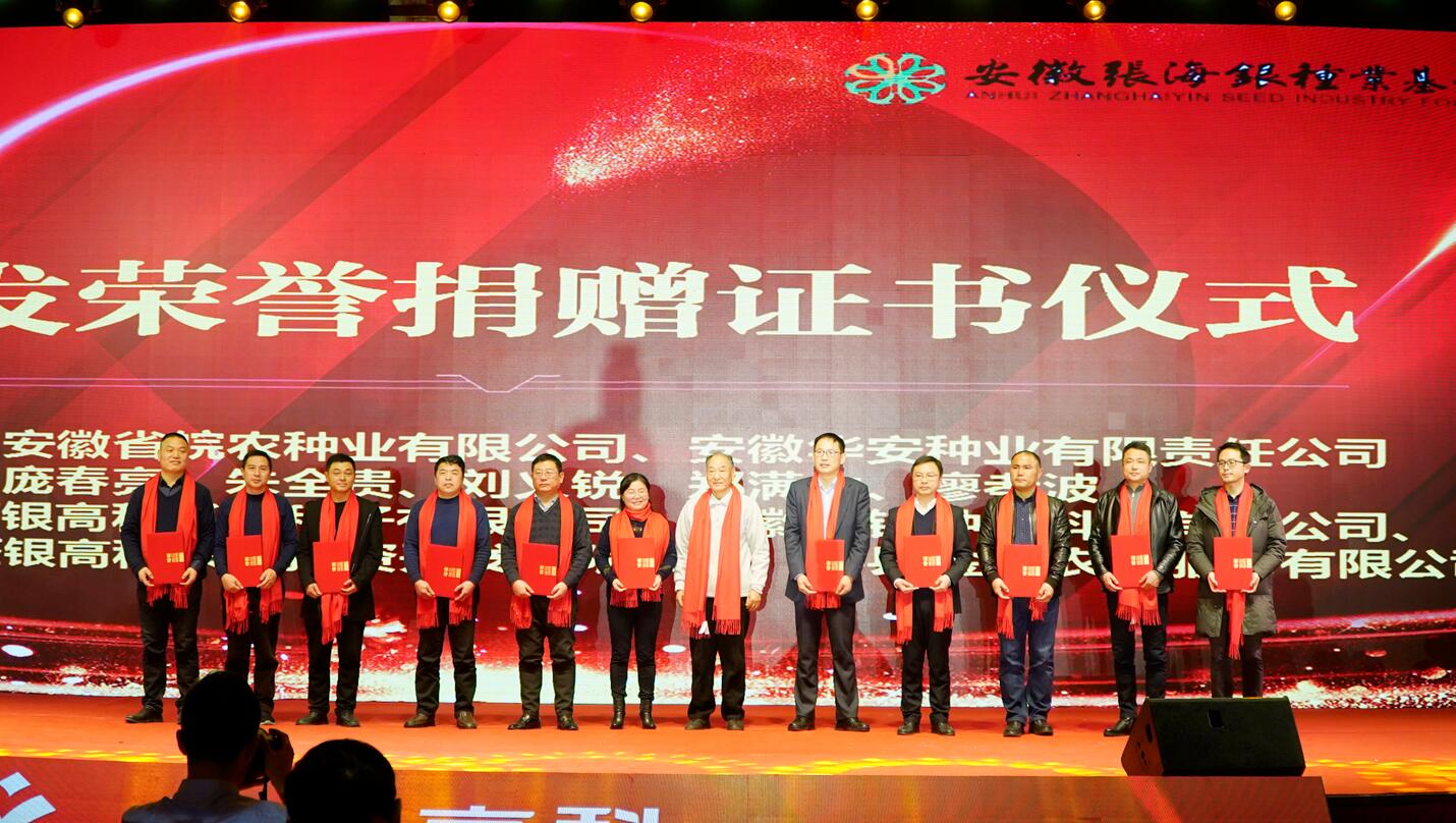 ?? “踐行公益,奉獻(xiàn)愛心”。會上,進(jìn)行了安徽張海銀種業(yè)基金會頒發(fā)捐贈證書儀式,眾人拾柴火焰高,希望更多的人關(guān)注慈善公益事業(yè),為公益多盡一份力。