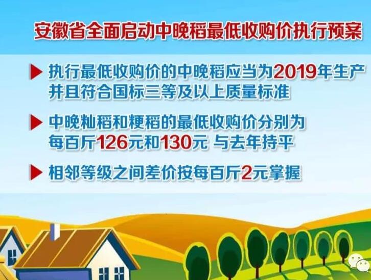 ??? 近日,從省政府新聞辦舉行的新聞發(fā)布會(huì)上了解到,從現(xiàn)在開(kāi)始到2020年1月31號(hào),安徽省全面啟動(dòng)中晚稻最低收購(gòu)價(jià)執(zhí)行預(yù)案,執(zhí)行最低收購(gòu)價(jià)的中晚稻應(yīng)當(dāng)為2019年生產(chǎn)并且符合國(guó)標(biāo)三等及以上質(zhì)量標(biāo)準(zhǔn),中晚秈稻和粳稻的最低收購(gòu)價(jià)分別為每百斤126元和130元,與去年持平,相鄰等級(jí)之間差價(jià)按每百斤2元掌握。