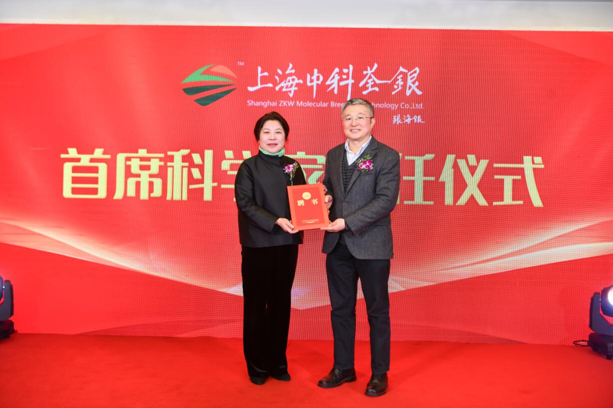 ? ? ?韓斌院士在致辭中首先向關(guān)心支持上海中科荃銀的各位領(lǐng)導(dǎo)、嘉賓表示感謝。他表示,基礎(chǔ)研究與應(yīng)用研究結(jié)合,一定能為育種創(chuàng)新開辟出新路子。上海中科荃銀的成立既有挑戰(zhàn),更是機(jī)遇,上海中科荃銀各團(tuán)隊(duì)將珍惜機(jī)遇,努力為中國(guó)種業(yè)技術(shù)創(chuàng)新與技術(shù)進(jìn)步作貢獻(xiàn)!會(huì)上舉行了上海中科荃銀首席科學(xué)家聘任儀式,上海中科荃銀董事長(zhǎng)張琴女士為韓斌院士頒發(fā)聘任證書。